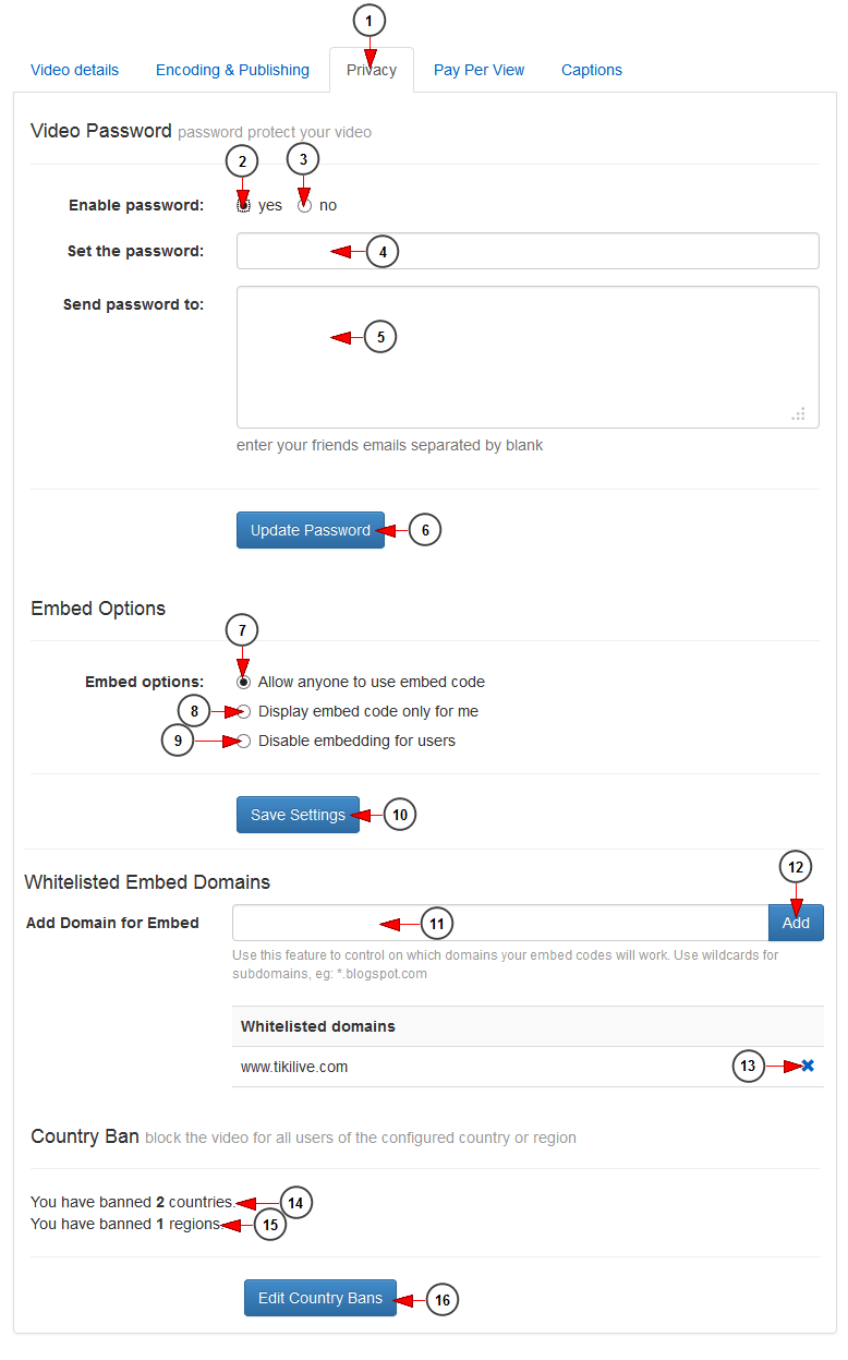 On this page, you can set a password for the video, manage the embed options or block access to video for users from different countries or regions:
